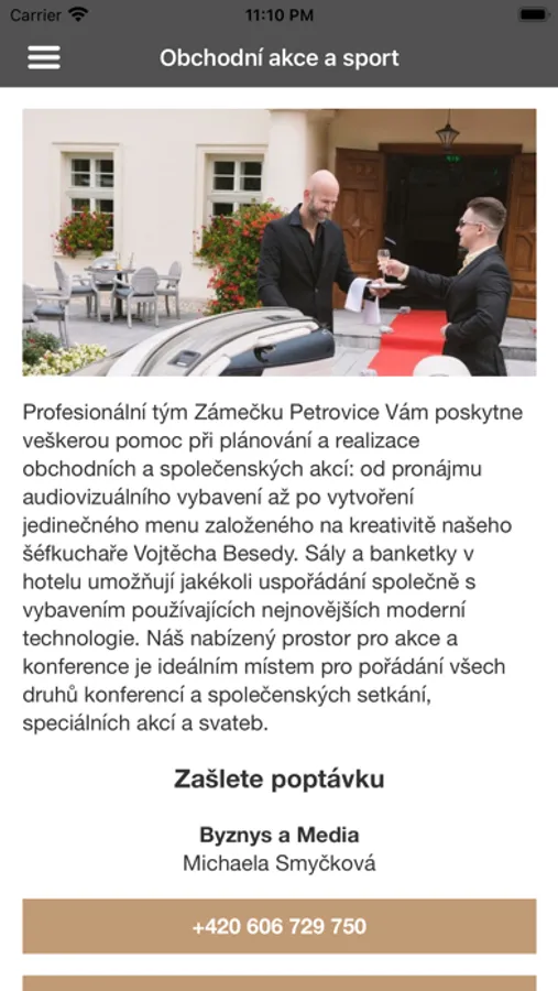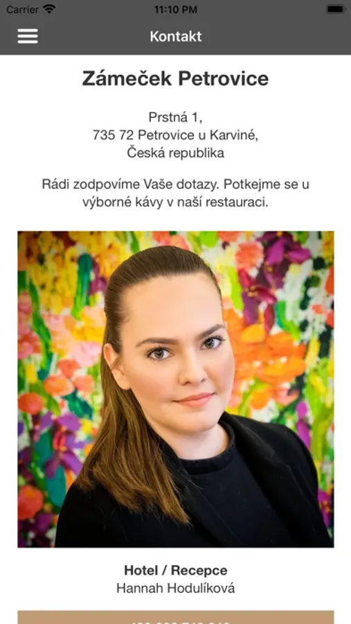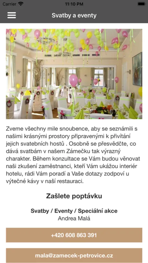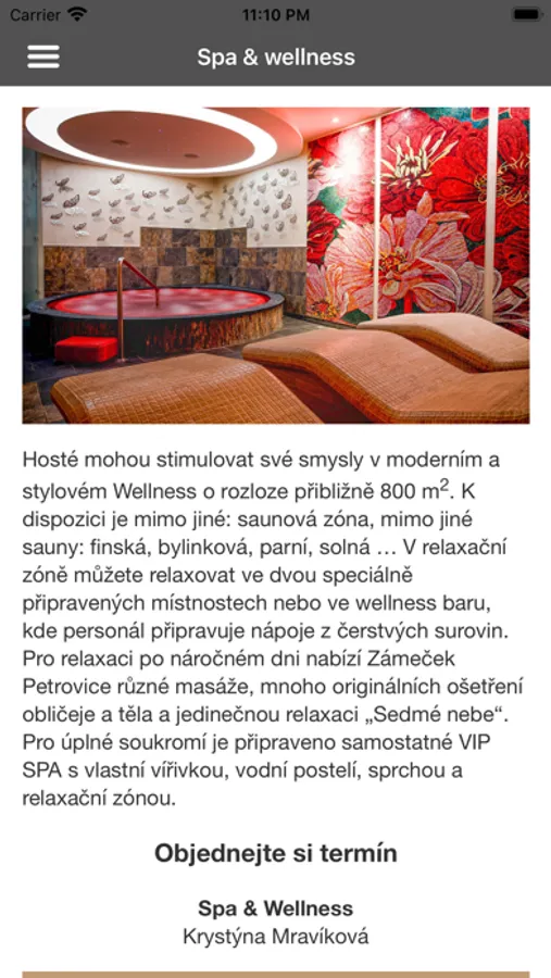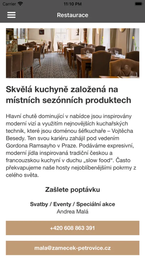 Aplikace Zámeček Petrovice obsahuje důležité informace o hotelu. Přes aplikaci si můžete zarezervovat pobyt v hotelu nebo stůl v restauraci, prohlédnout si fotografie, přečíst si aktuality nebo se dozvědět víc o službách hotelu. Aplikace obsahuje také informace o ubytování, restauraci či wellness, potřebné kontakty, GPS navigaci a důležité odkazy.