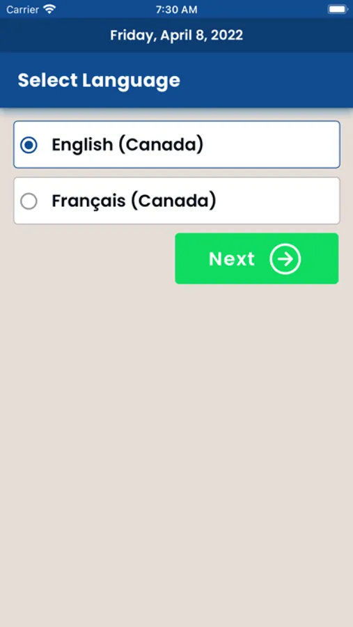 Languages available: French (Canadian) and English (Canadian). The user can change the language any time in the App.