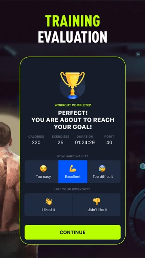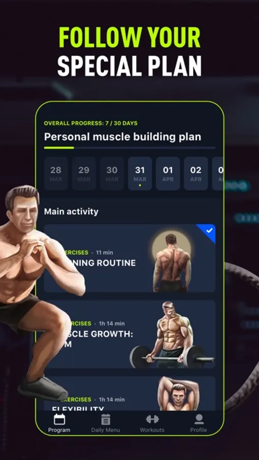 Muscle Master meticulously tailors each track for your body type and needs. Just specify your body type, goal, and muscle groups that need to improve at the beginning. The rest will be sorted out automatically.