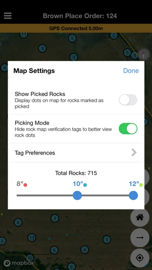 Features include:- Filter by size of rock- Flag problem rocks- Automatically save a record of the path traveled in the field and which rocks were picked for future reference