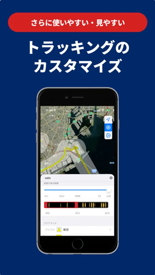 トラッキング表示は、様々にカスタマイズ可能です。アイコンと色の変更、捜索範囲の設定、さらに30日前まで遡って経路を表示することなどが可能です。