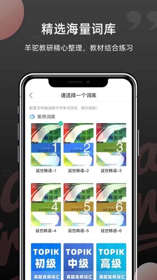 延世教材,topik考级,精选高频词汇,还有美食,电影词书任你挑选,教研大大一直在努力填充更多词库哦