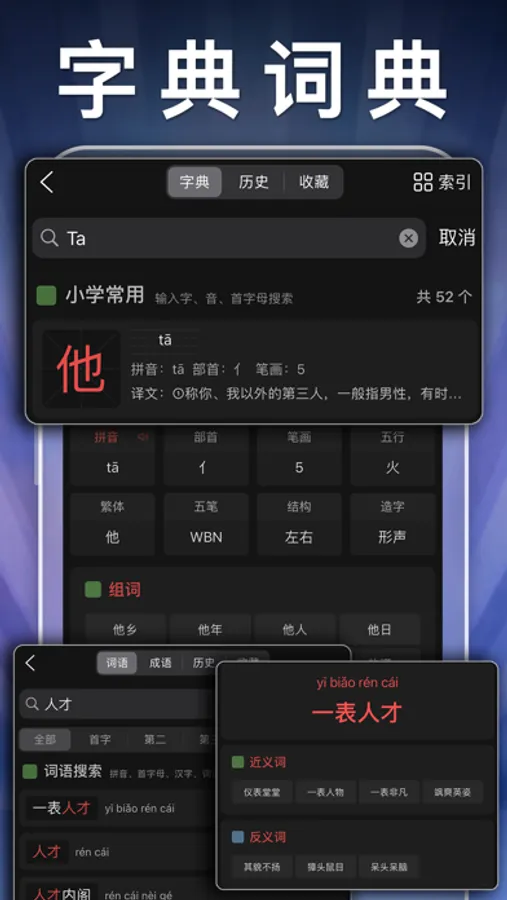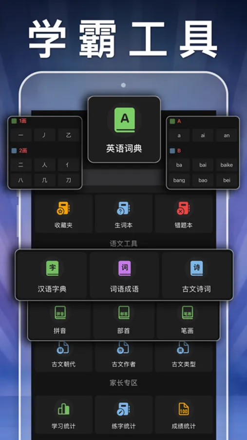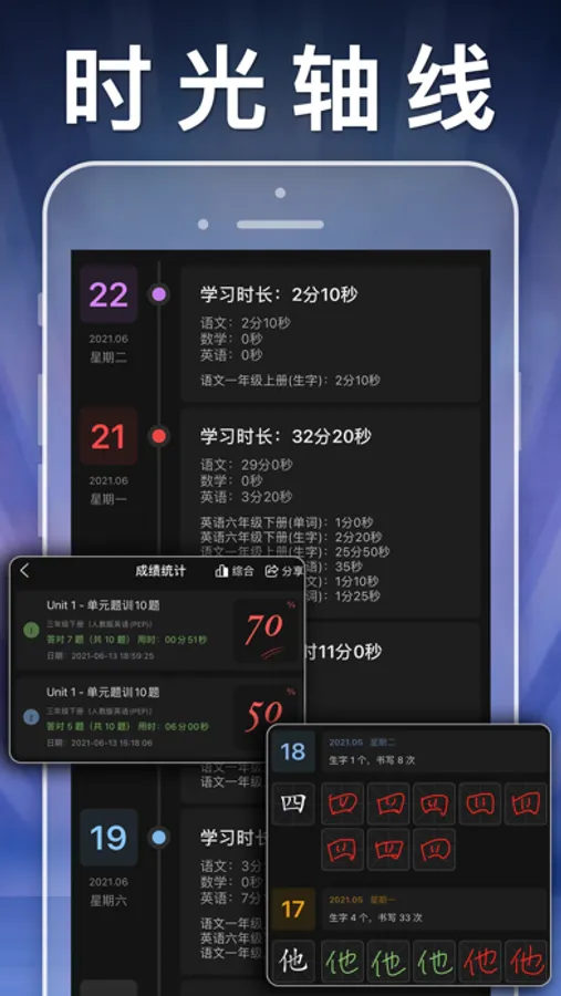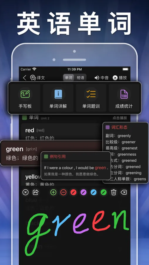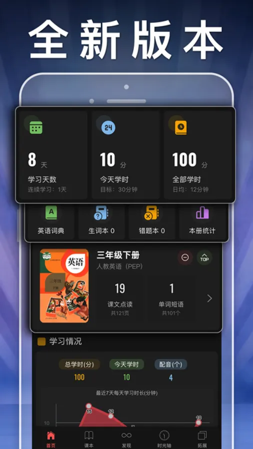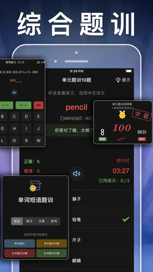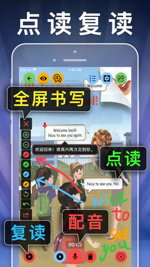 功能特色:同步点读、趣配录音、全屏手写、单词训练、词语测验、学习成就