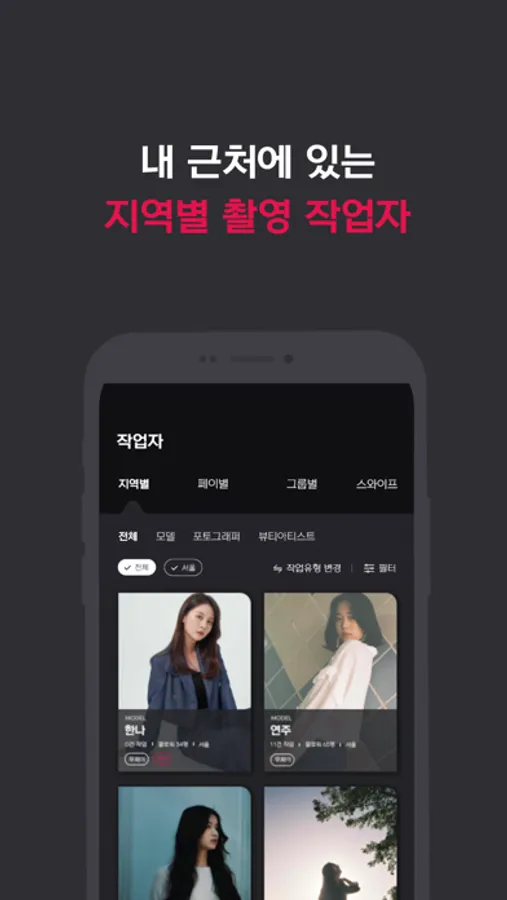 페이 종류, 활동지역, 촬영 컨셉 등 원하는 필터*를 설정하여 모델, 포토그래퍼, 뷰티아티스트 등 다양한 촬영 작업자를 탐색할 수 있어요. 지역별 검색을 통해 내 근처에서 활동하는 작업자를 찾아보세요.