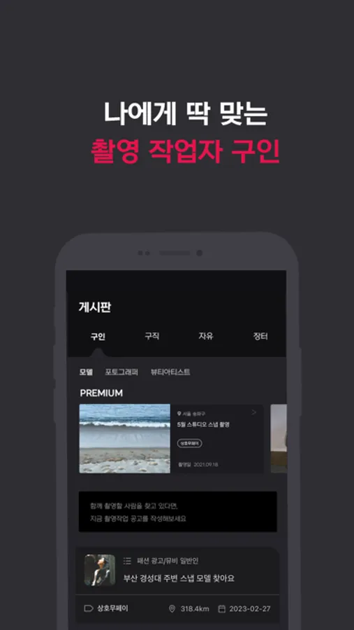 구인글을 작성하고 나의 촬영 작업에 딱 맞는 사람을 기다려보세요. 촬영 장소, 촬영 컨셉, 촬영 비용 등 구체적인 정보를 적을 수 있어요.