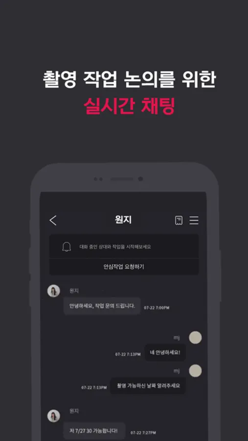 함께 촬영하고 싶은 사람과 1:1 대화를 통해 촬영에 필요한 레퍼런스를 공유하고, 각자의 작업물을 보며 심도있는 작업 논의를 나눌 수 있어요.