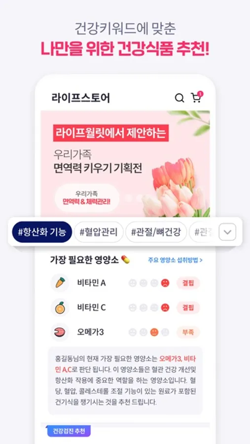 나에게 지금 부족한 영양소, 건기식 구매에 도움을 줄 수 있는 건강 테마를 확인하시고 바로 라이프월릿에서 구매까지 할 수 있습니다.