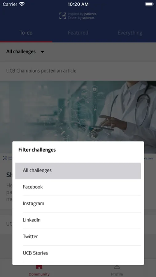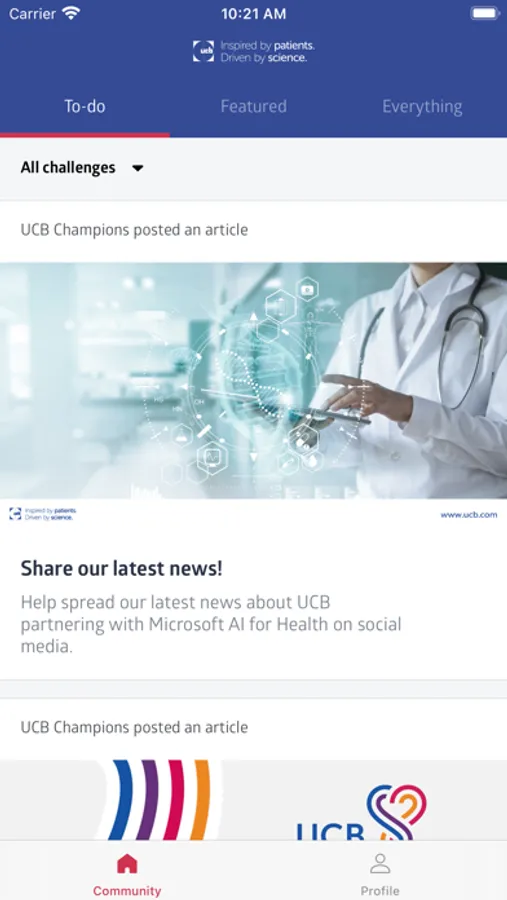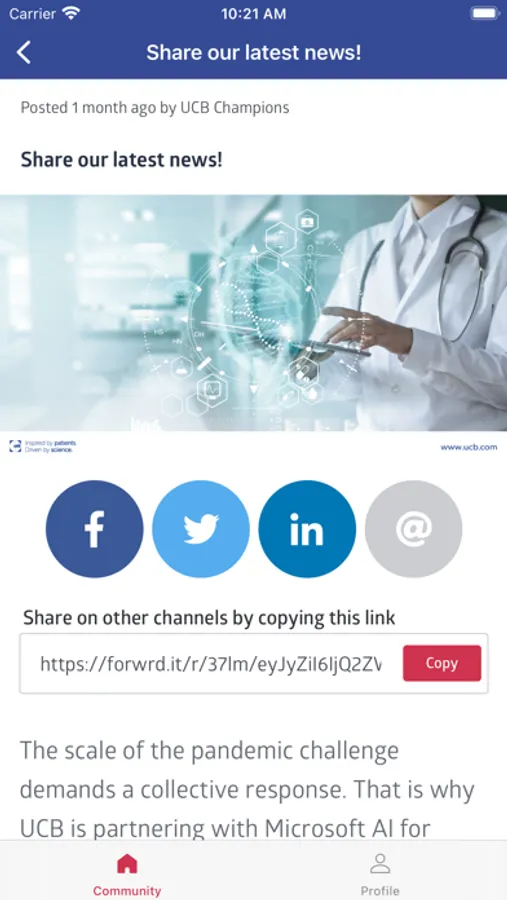 The UCB Champions’ app is meant to help you easily and safely engage with our corporate social media channels: Facebook, Twitter, LinkedIn and Instagram.