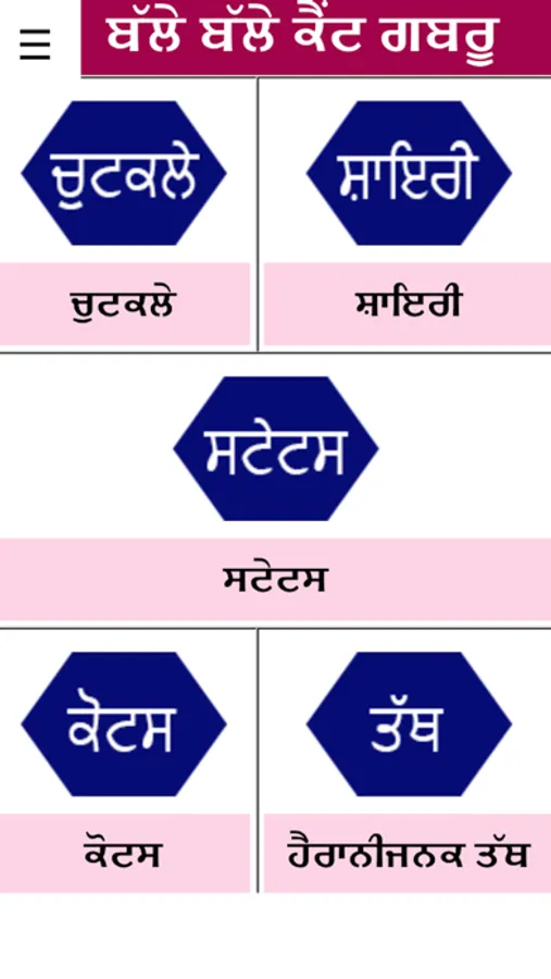 This app is for Punjabi Language Lovers all fun around this app like Jokes, Quotes, Shayari, Status, Amazing Facts, Puzzles, Antakshri, Stories.