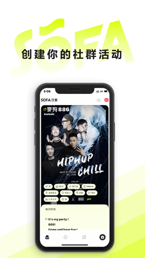 核心团队由极具个性的年轻人构成,希望通过「Sofa沙发」把认可我们气质的用户、粉丝聚拢在一起,为当代年轻人提供召集与交流、在线票务等整套服务。