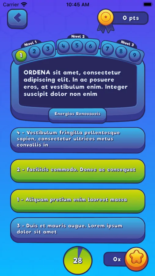 Tem 30 segundos para responder corretamente a cada uma das 60 perguntas que são divididas por 4 temas e por 3 níveis de dificuldade para cada tema.