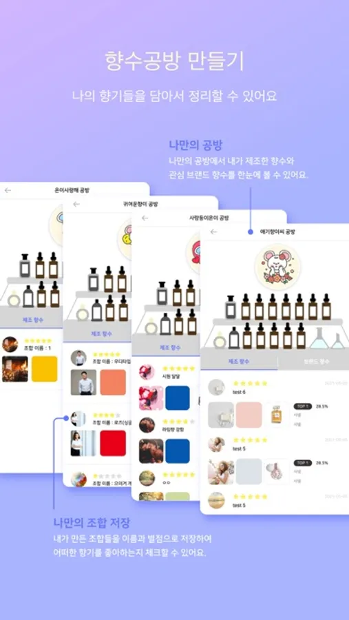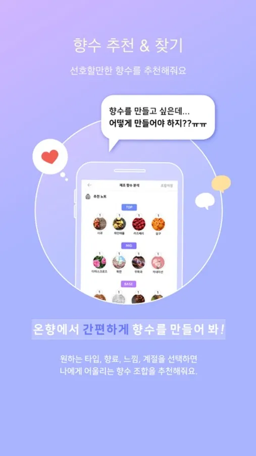 선호하는 향수와 취향을 분석하여 향수를 추천하고 나만의 최애향수를 만들 수 있습니다.