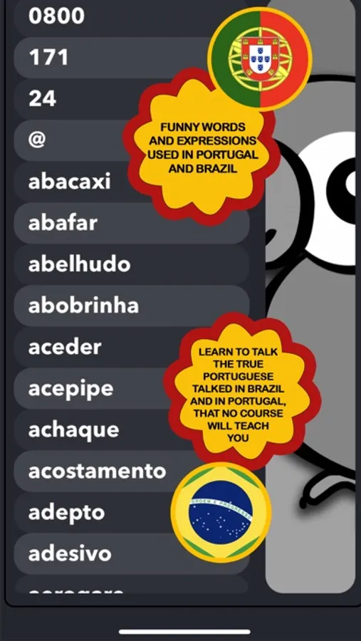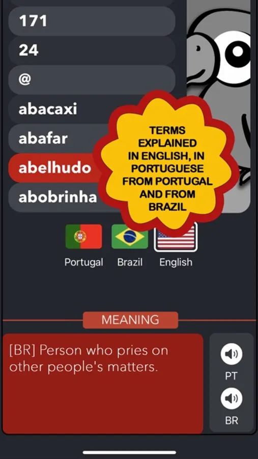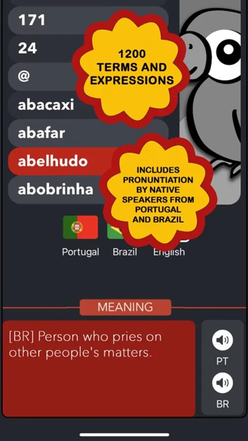 We have prepared this app, a kind of guide/dictionary that presents thousands of terms and idiomatic expressions used on both countries, highlighting their differences and including pronunciations in both languages, by native speakers.