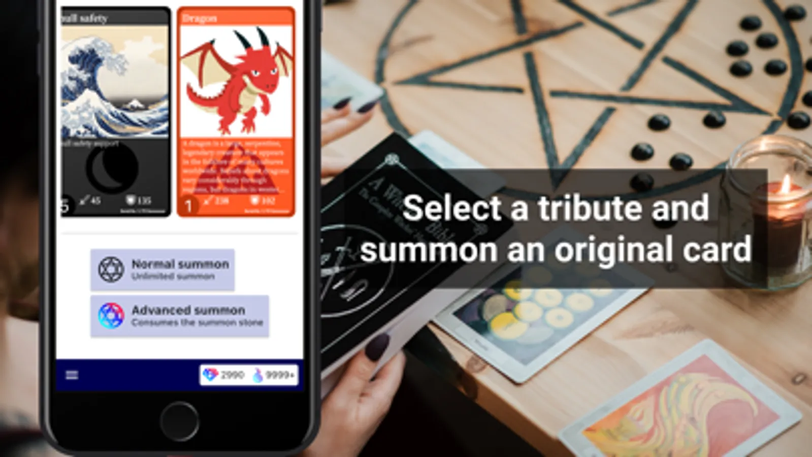 Select an image as the tribute for the card, decide on the card name, and the original card will be summoned. The status of the card depends on your luck.