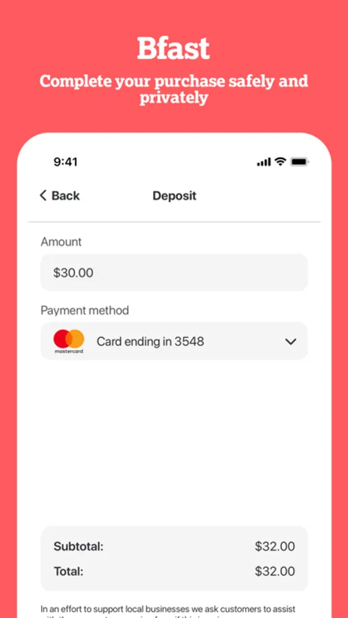 BFast's Stripe encryption system keeps your financial info private when you spend. Now your credit card or bank account won't go out to every coffee shop, bar, restaurant, and retail shop you visit.