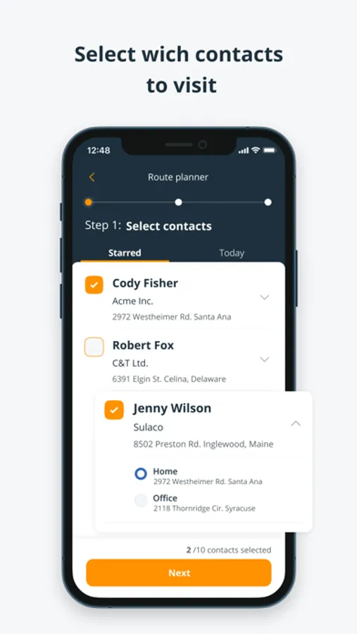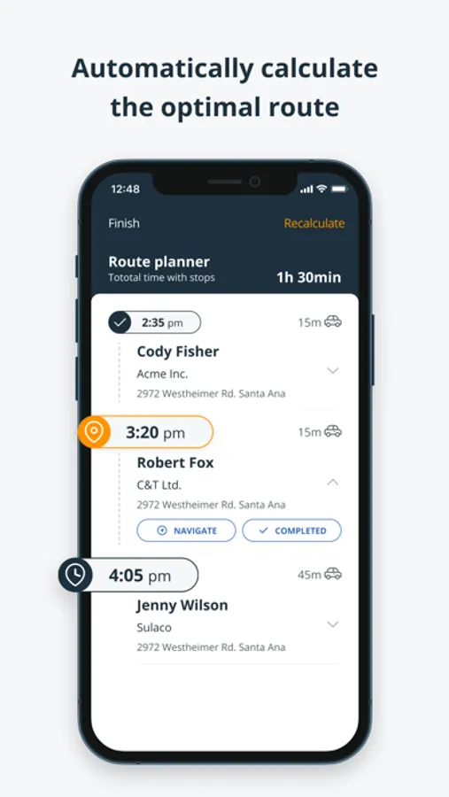 No need to hop between your map applications and your CRM contact list. With the Route Planner, you can simply select the contacts you want to visit from your Starred list or the ones with the Next Actions scheduled for Today. We’ll automatically arrange them into an optimal list and will navigate you from one stop to another. You can set the average time required for a meeting, and we’ll factor it in your overall visit time, so you can plan the rest of your day accordingly. You focus on your winning pitch and your meetings, we’ll take care of getting you there as fast as possible.