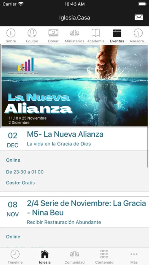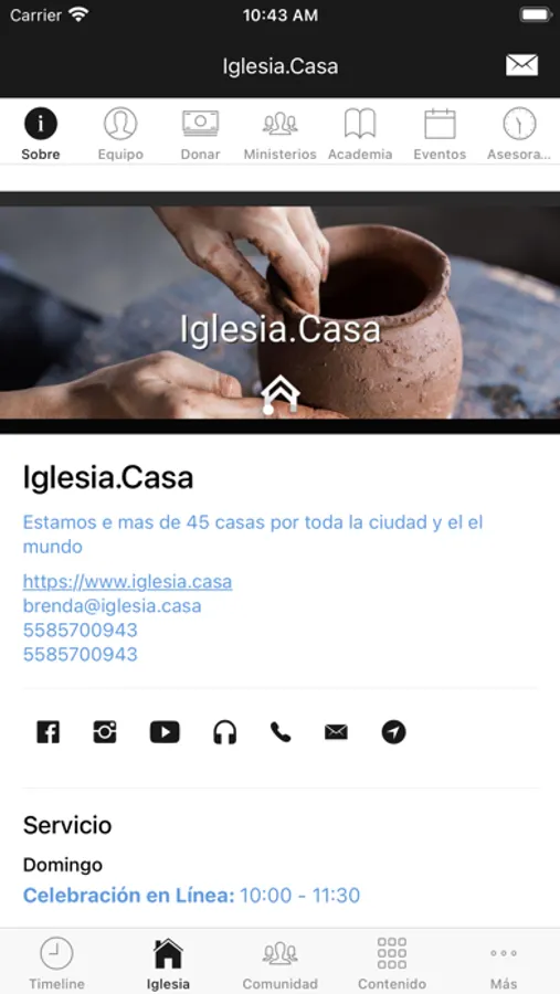 - Información de la iglesia (dirección, teléfono, sitio web, redes sociales, pastores)