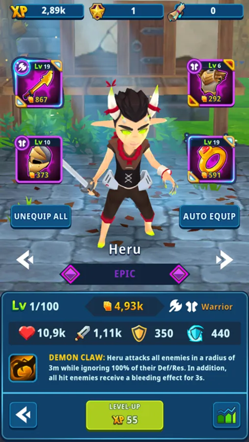 Use summoning scrolls to unlock rare heroes through the summoning portal and gather experience points to upgrade their levels. Try to unlock the legendary heroes of Idle Dungeon Manager to unleash your full potential. Collect different classes like warrior, archers, mages, and many more.