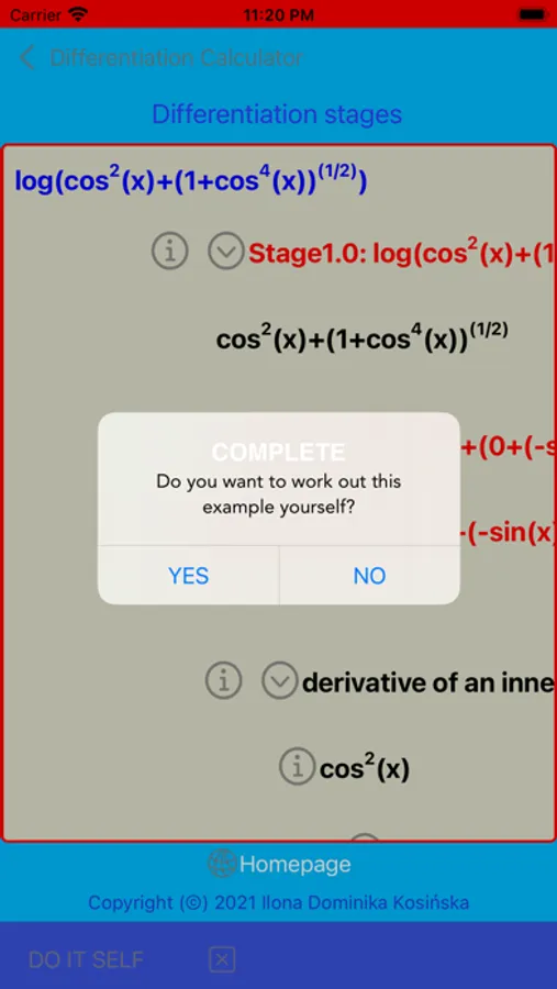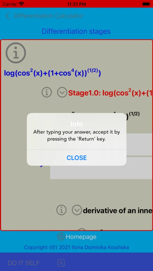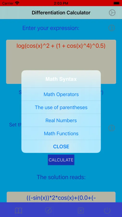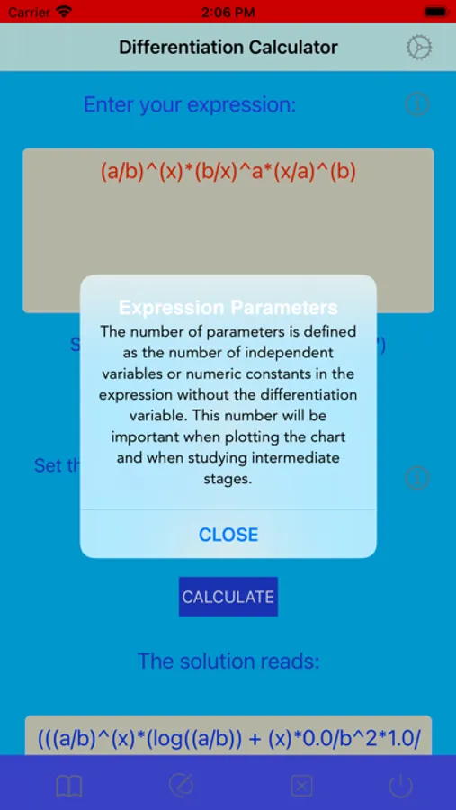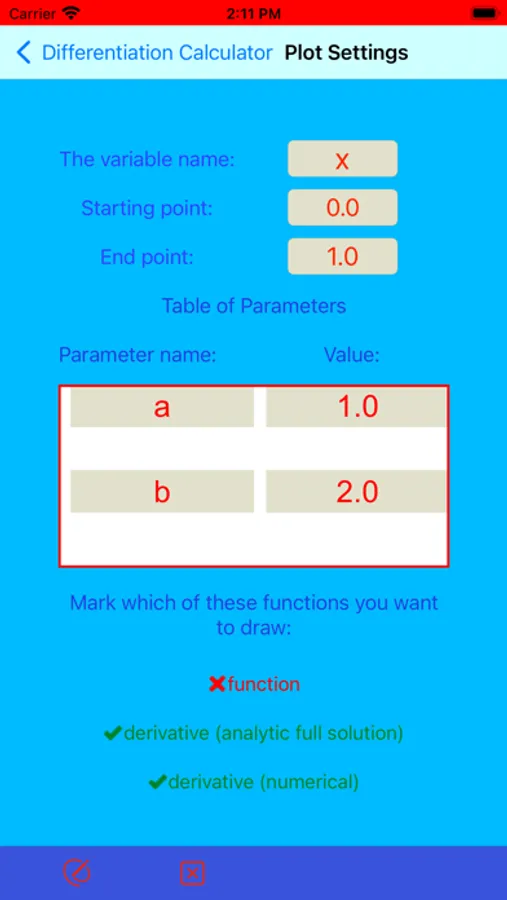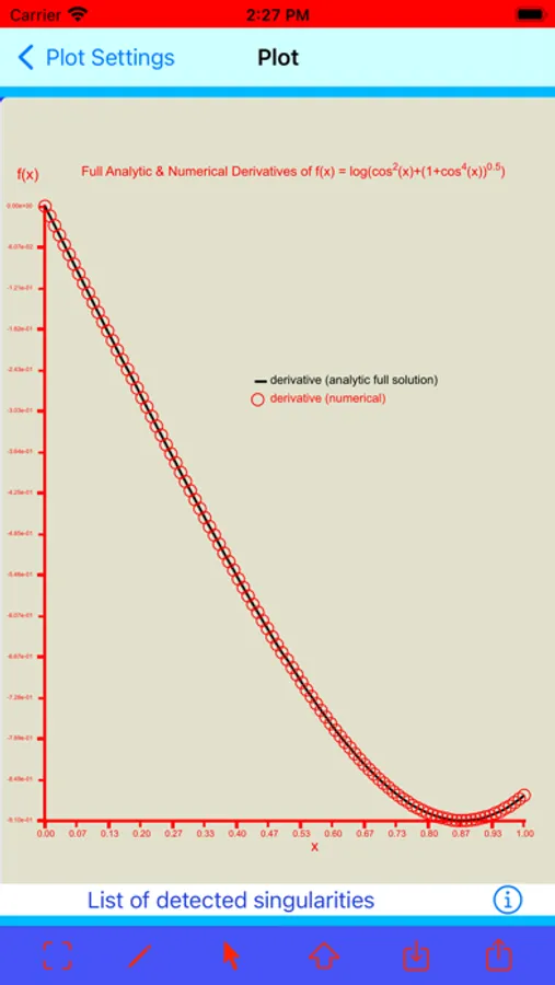 This app calculates the analytic formula of the first derivative of a given function. Derivative represents a rate of change of a function with respect to an independent variable. This app enables to differentiate a function that depends on more than one independent variable (called here a multi-parametric case) by considering these variables separatelly. To do so, one must declare a name of independent variable with respect to which a given function is differentiated. During differentiation, the rest of variables is kept constant. The derivative found on the basis of the obtained analytical formula can be compared with the derivative found numerically. The obtained results can then be depicted in plots. In order to plot a multi-parametric case, all remaining independent variables must be set by the user. To make this app more didactic, it is possible to track and practise intermediate stages of searching for the analytic derivative. All these steps can be performed by the user himself. In this way, the final formula of the derivative sought will become more understandable.