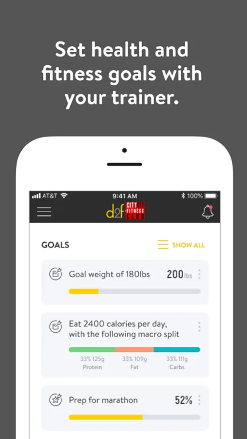 With the D2f Cityfit App, you can start tracking your workouts and meals, measuring results, and achieving your fitness goals, all with the help of your personal trainer.