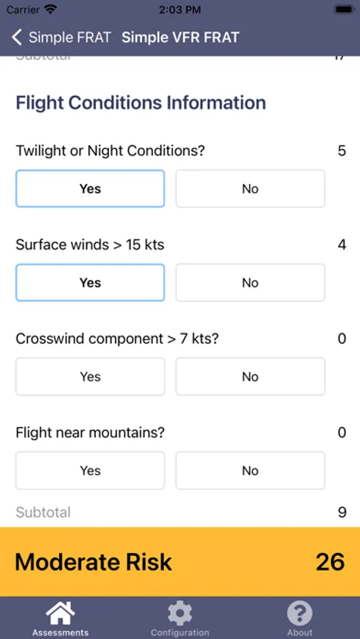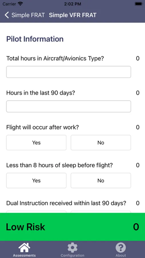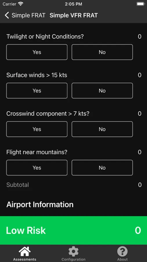 Proper risk assessment is an integral part of Aviation Decision Making (ADM). Simple FRAT enters this space as tool in your ADM toolkit allowing you to consistently evaluate the risk of your proposed flight against a standard set of risk factors, identifying the potential risk level of the flight. It is ultimately the Pilot In Command's decision to make the flight, but Simple FRAT can help make that decision more methodical.