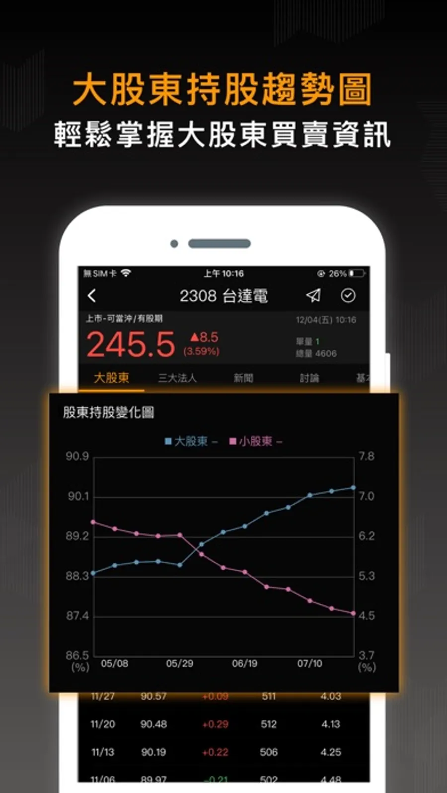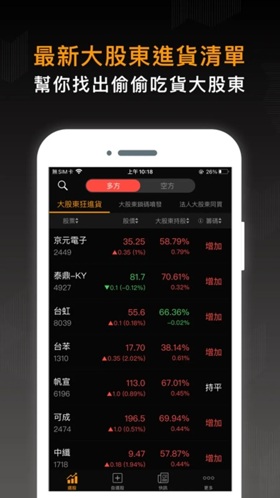 免費股市籌碼看盤APP,提供最新的大股東進貨清單,跟著大股東搭上股票上漲行情。提供即時股票報價,掌握最新價格動態,還有全台最大股市討論社群,解答你所有投資問題。