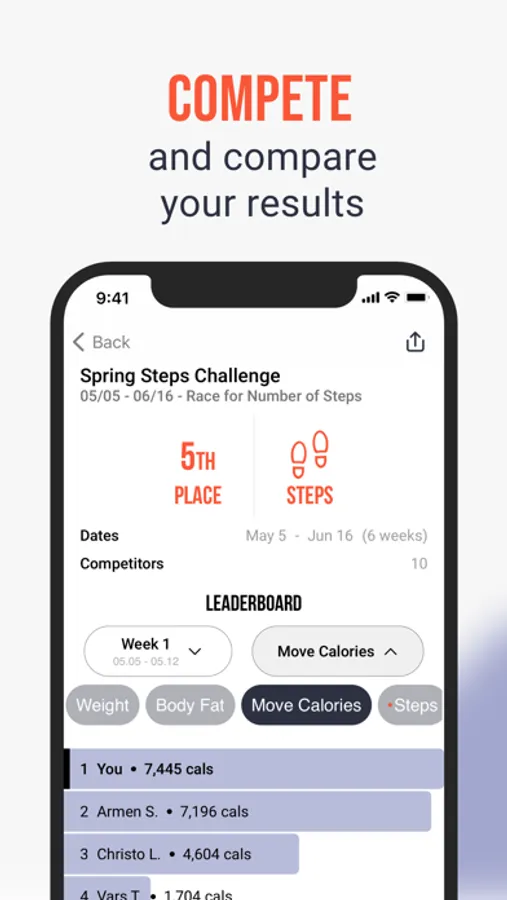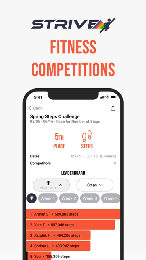 Strive has built an interactive Leaderboard so you can compete in fitness competitions with friends in 7 different competition types including weight loss, body fat, steps, move calories, exercise minutes, distance, and BMI. We integrate with the Health App and your Smart Scale. Benefit from our charts and graphs to see your data from the Health app.