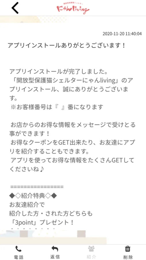 にゃんlivingのアプリをSNSを通じてお友達に紹介する事ができます。