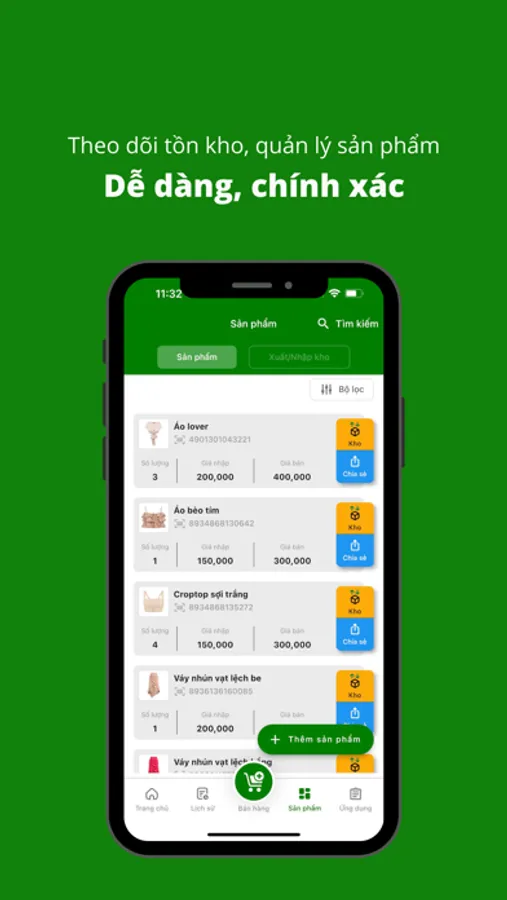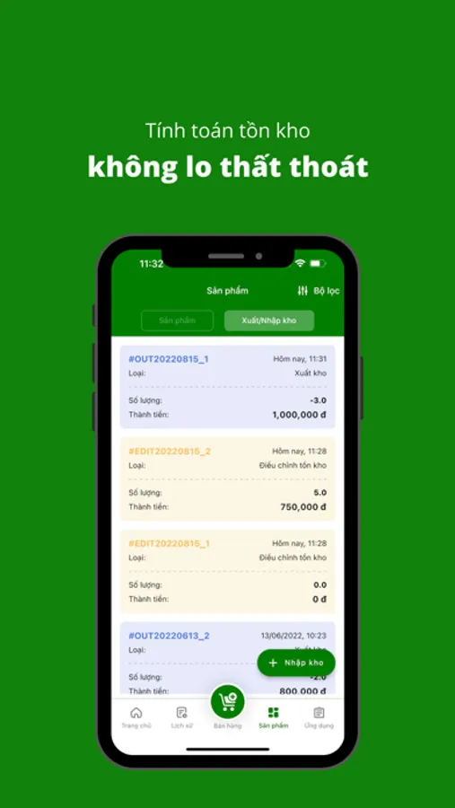 - Theo dõi chi tiết tồn kho, lịch sử xuất nhập và điều chỉnh kho
