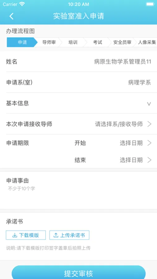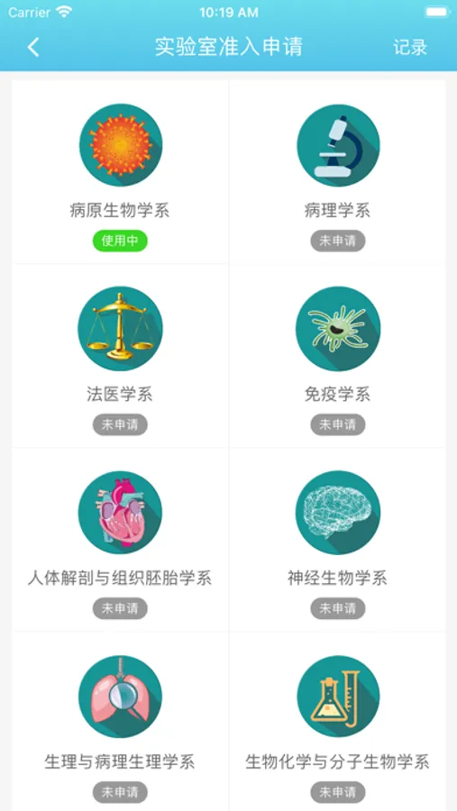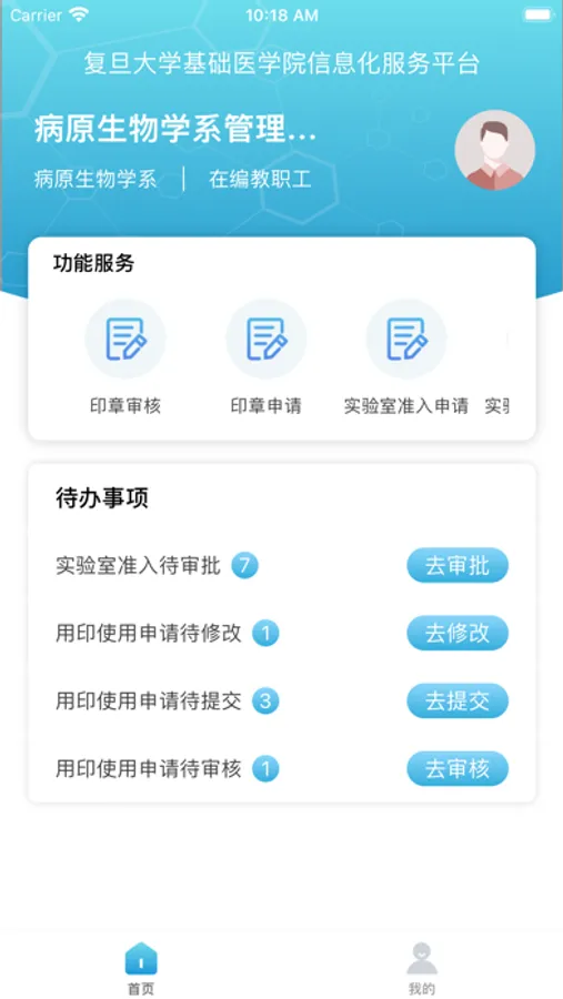 复旦基础医学院目前基本功能为门禁卡的申请和审核。学生可通过平台申请各学科实验室门禁卡的使用。管理人员可在平台审核学生是否可以使用门禁卡。