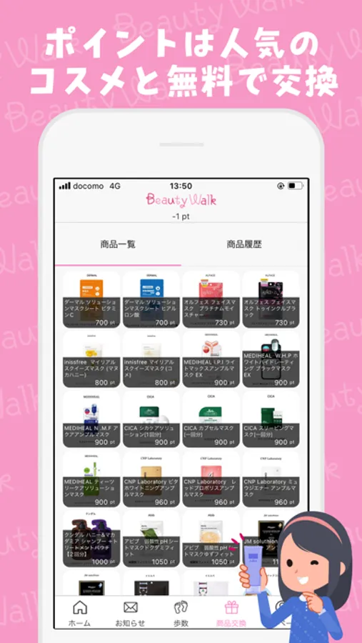 たくさん歩いてポイントを貯めて人気のリップやコスメ、フェイスマスクなどのスキンケアをゲットしましょう!