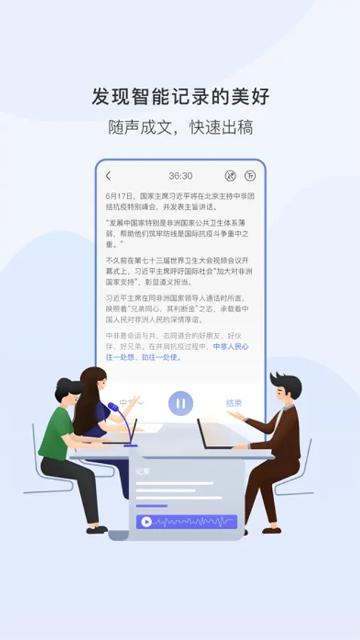 “神奇速记”的语音转写功能和人工校正相结合,完整、精确记录会议内容,不再烦恼错失重要信息。