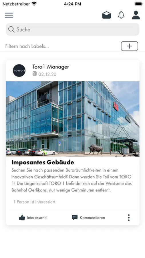 Willkommen auf der Toro 1-App, der App rund um das digitale Arealmanagement. Mit dem digitalen Assistenten sind Sie bestens informiert, kommunizieren einfach und nutzen hilfreiche Dienste.