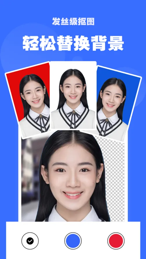 主要功能:斑马证件照能够根据您的照片智能抠图,您只需要选择规格背景,几十秒就能制作出令您满意的证件照!