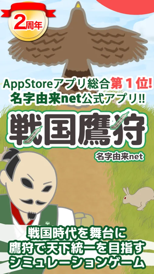 日本の好きな地域を選び、自分の名字を冠した国の長としてゲームをすすめます。鷹狩をし、獲物を捕まえることで、稲ポイントを増やします。稲ポイントを活用し、建物や武器を手に入れることができるので、家臣を増やしながら、国を大きくしていくのがあなたの使命です。 途中、外部から攻めてくる武将や侵入者などが多数やってきます。国を守り抜くためには商人から鉄砲や武器や防具を効率よく手に入れることも重要。国が大きくなっていくと南蛮人や朝廷、中国大陸から使者がやってくることもあり、次第に有名になっていきます。最初は伴侶と自分の二人だけ。これから先、あなたの国は戦国時代を生き抜き、天下統一を果たすことができるのか・・・。