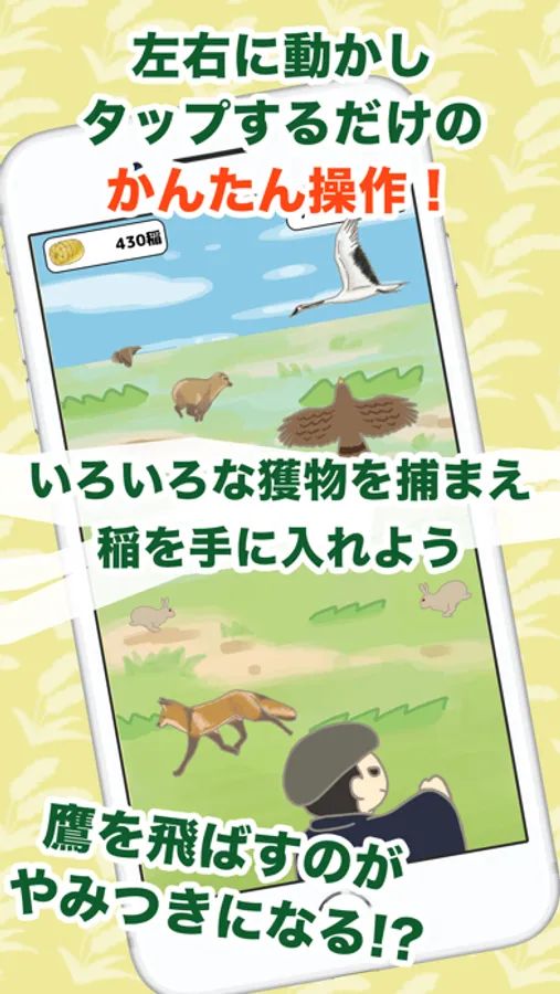 鷹匠をタップすると鷹が飛んでいき、左右から現れるいろいろな獲物を捕まえることができます。捕まえた獲物が稲ポイントになります。