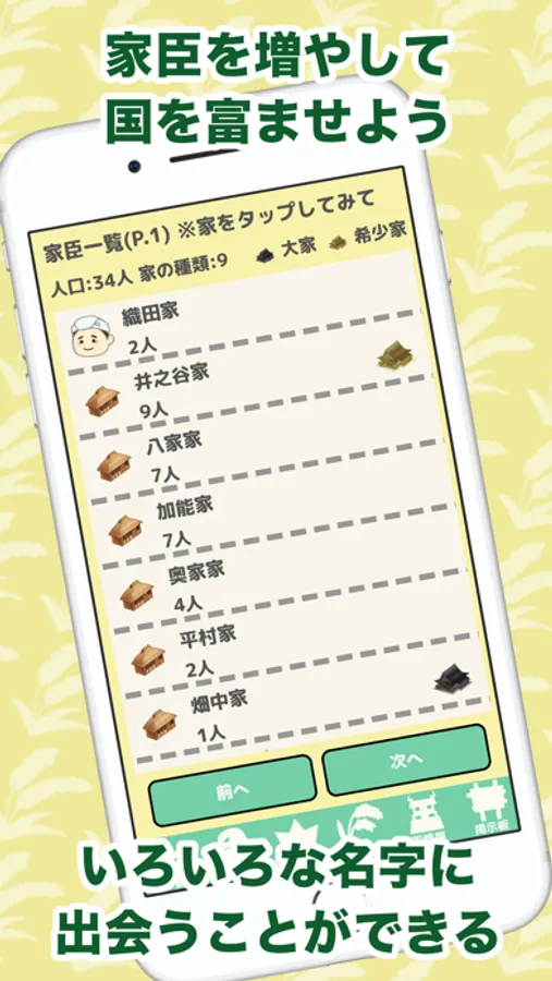 ゲーム形式で仙人の出す名字(苗字)のクイズに答えたり、侵略者と戦ったりするため、自分の知力や国育成の視点も必要とします。