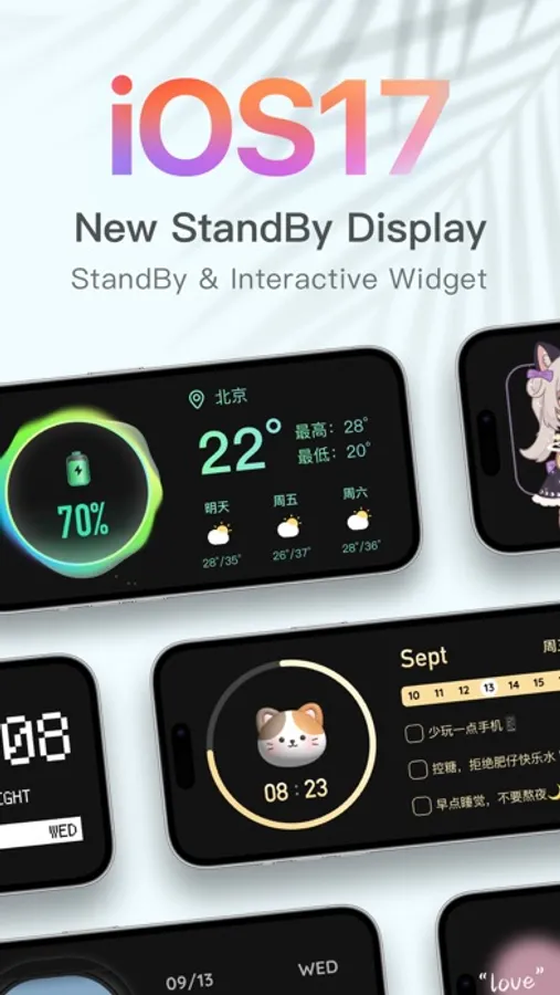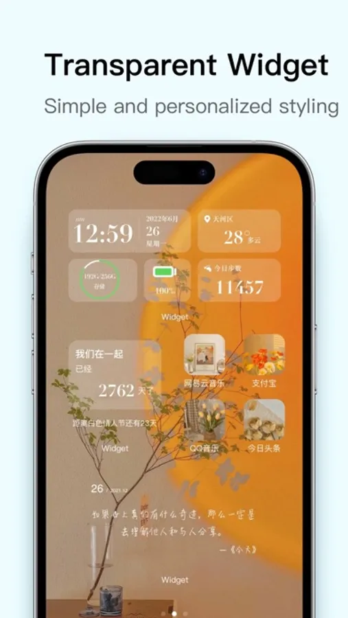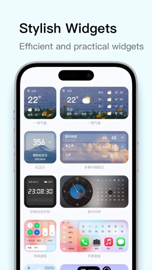 Various practical widgets: weather, clock, calendar, countdown day, shortcut, mobile phone panel widget, steps widget. The step widget will get the HealthKit data regularly, making it easier to view the step data on the screen.