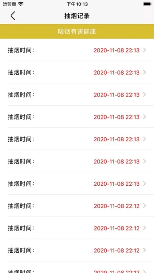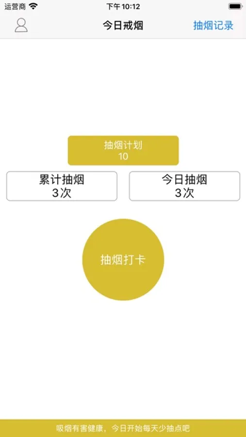这个是极简实用的戒烟App,抽烟时候打卡,然后记录你抽烟的次数,希望您可以早日戒烟!
