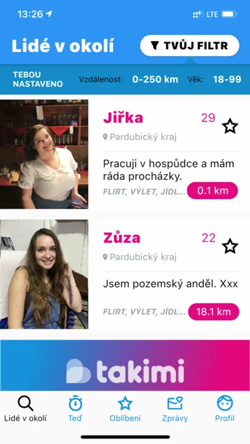 V Takimi můžeš anonymně procházet všechny profily ve vzdálenosti, do které jsi ochotný dojet na rande. Každý den tak možná narazíš na desítky známých tváří, kolem kterých procházíš na ulici. Kromě aktuální polohy můžeš hledat na základě pohlaví, věku a zájmů. Stojí ti však za to je oslovit?