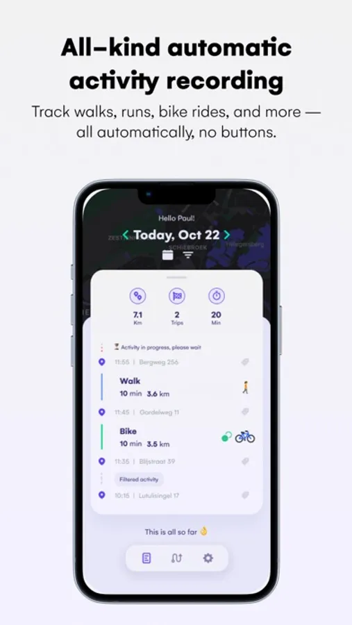 Motion app allows you to keep track of all your activities: walks, runs, bike rides, and more — all automatically (but also manually if that is your preference); and lets you join mobility programs organized by your employer or city. It's like an activity journal; we automatically detect, categorize and keep a record of all of your activities. We use the data collected by the app to provide you with financial rewards, in the form of giftcards or virtual debit cards (cash), which are part of these programs.