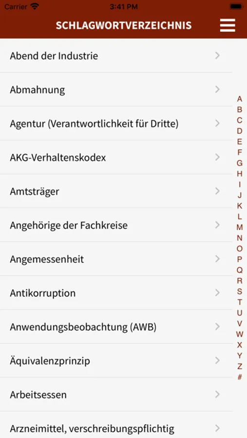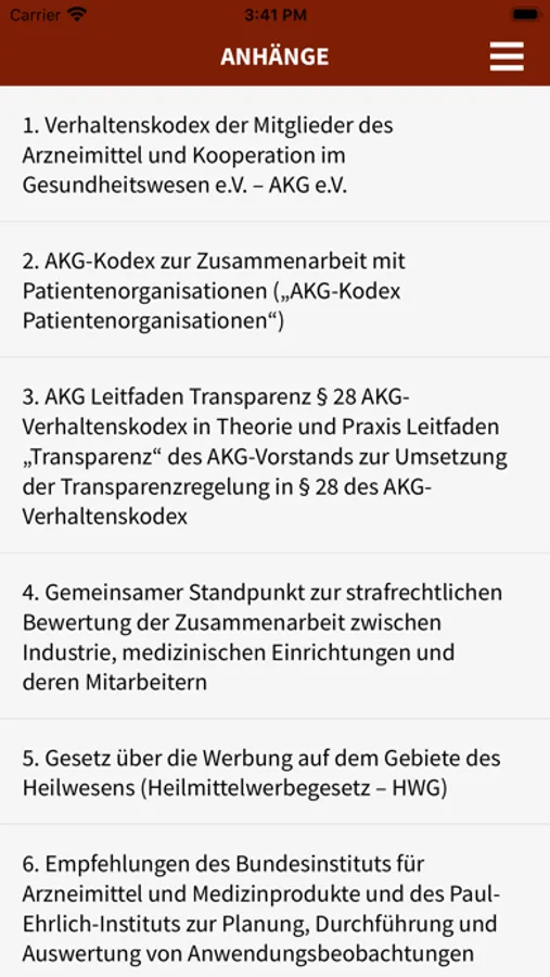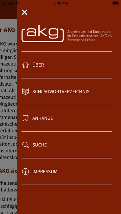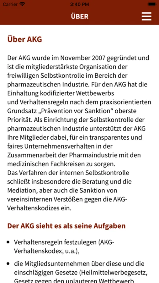 Der Leitfaden der AKG beinhaltet den Pharma-Verhaltenskodex. In der App steht der vollständige Leitfaden zur Verfügung, sodass er immer griffbereit ist und jederzeit zu Rate gezogen werden kann. Besonders hilfreich und praktikabel ist die App durch die schnelle Stichwort-Suche, die sofort wichtige Ergebnisse bringt.