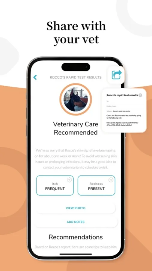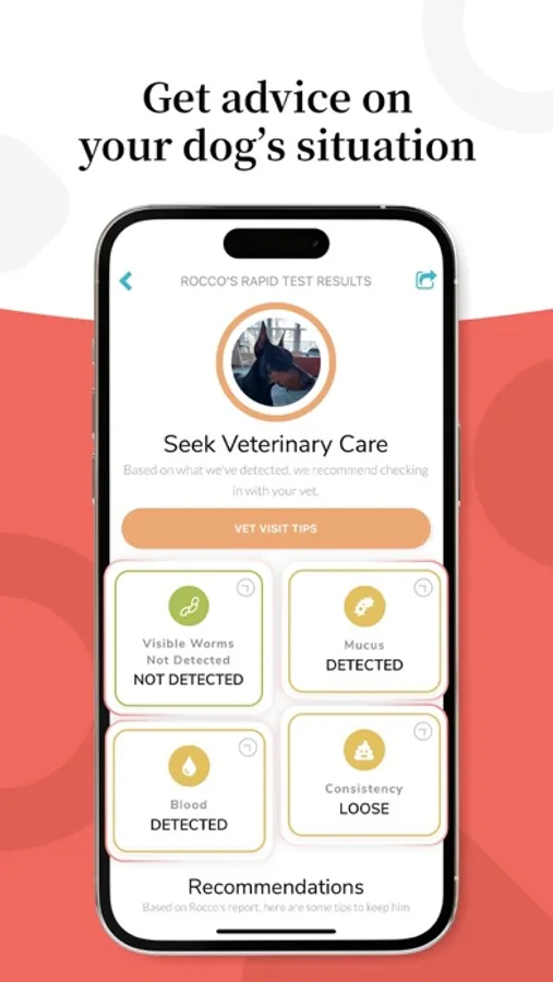 - 10-Second Health Check: instant dog health analysis for key dog health questions about abnormal poop, and itchy or flaky skin, such as “my dog has diarrhea,” “blood in dog stool,” and “dog’s poop is yellow”
