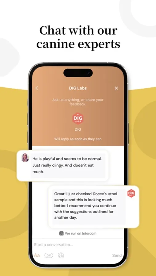 From “Help! My dog’s poop looks weird” to “Should I be concerned about this rash?” - use DIG Labs Dog Health Check anytime, anywhere, 24/7.