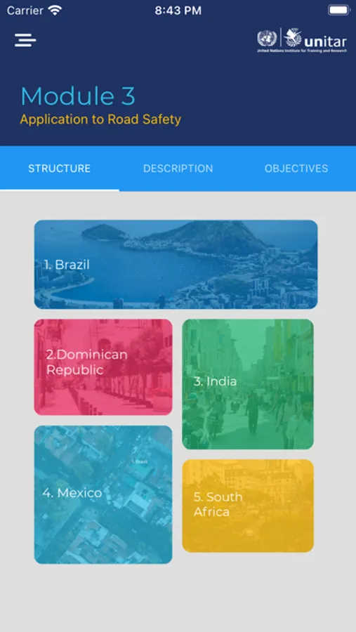 With the aim of contributing to advance road safety, the United Nations Institute for Training And Research (UNITAR) developed the "Management Practices for Safer Roads Toolkit Mobile App" which presents a practical management methodology that can be applied in the field of