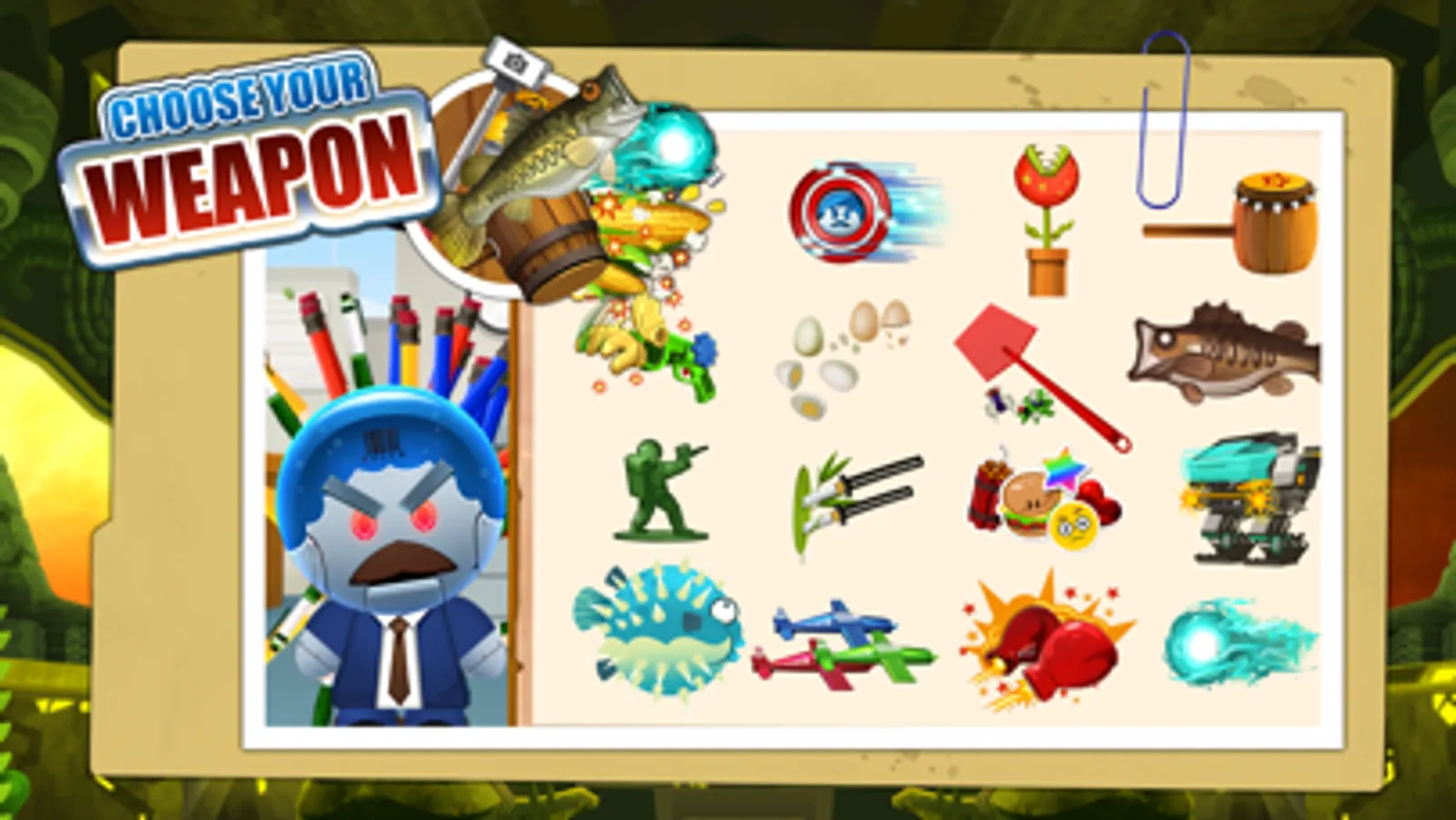 Crush robot enemies with never been seen before weapons! Release the mass havoc of fireworks, wield a samurai sword, or unleash the explosive power of the poop monkey on your workplace foes!