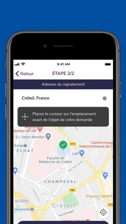 L’application Créteil l’œil citoyen vous permet en quelques clics de géolocaliser le lieu du désordre, de décrire ce dernier et de joindre une ou plusieurs photos afin d’informer en temps réel les services municipaux et territoriaux des incidents qui peuvent échapper à leur vigilance.