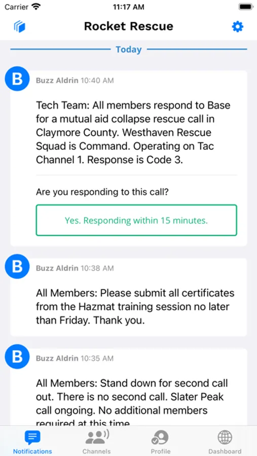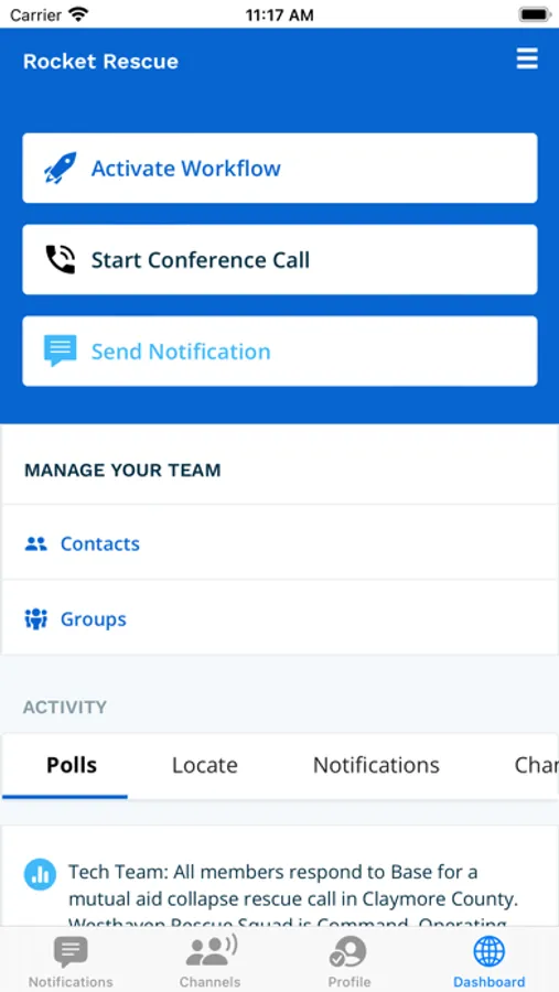 Connect Rocket Teams provides an invaluable communications hub for Emergency Services Organizations and Governments. Receive critical messages from your organization. Respond to polls, view attachments, manage your Duty Status and maintain your contact details.