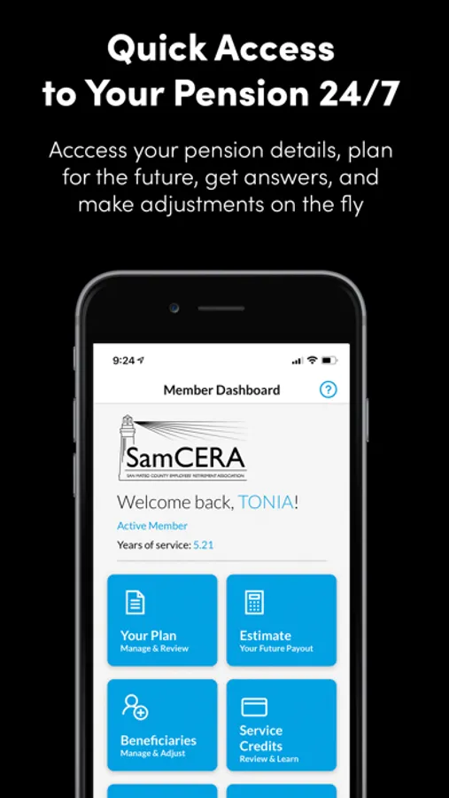 SamCERA Mobile is the new, self-service app created specifically for active and retired SamCERA members. By providing 24/7 access to your SamCERA account information and offering a robust set of management tools, SamCERA Mobile makes it effortless for members to plan, manage, and live better in retirement from anywhere.