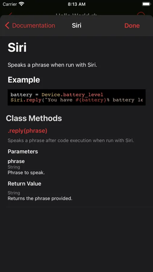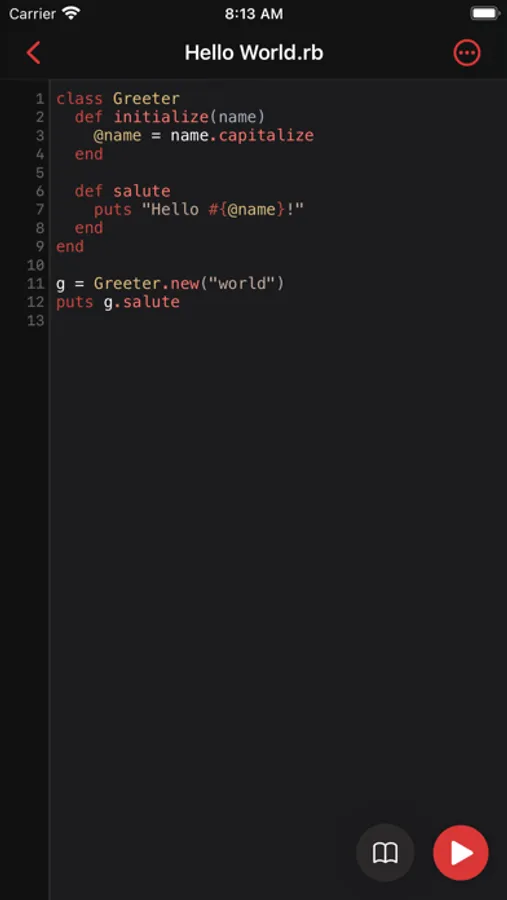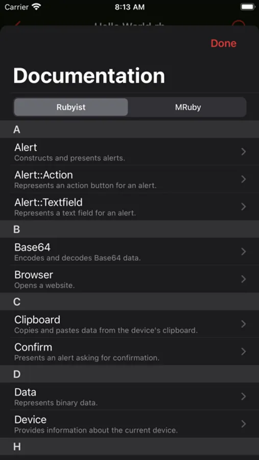 Rubyist allows you to run Ruby code on your iPhone and iPad using the MRuby VM. Run code directly in the app or via the Shortcuts app or Siri commands.